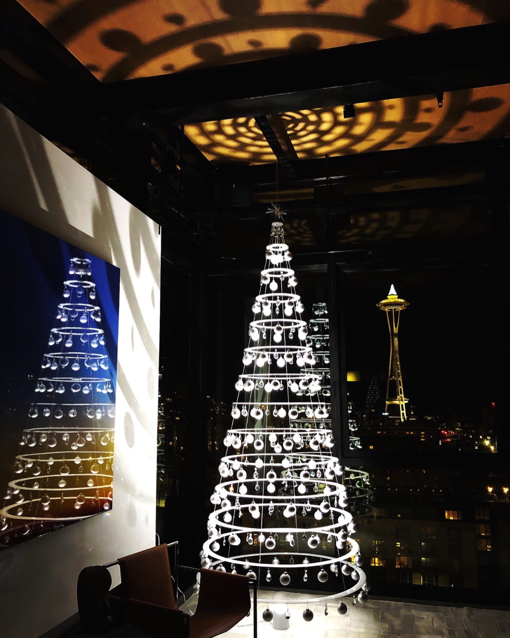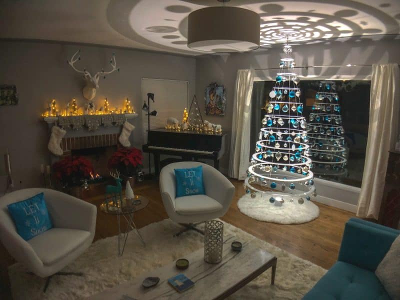 As a result, to install the Modern Christmas Tree is easy. With full decorations, it only weighs between 14-17 pounds. Therefore, it does not need to be secured from a stud in the ceiling. A simple drywall screw that supports up to 45 pounds will allow you to hang your tree any place you want versus needing to hang a traditional artificial tree from a stud in the ceiling based on their weight.