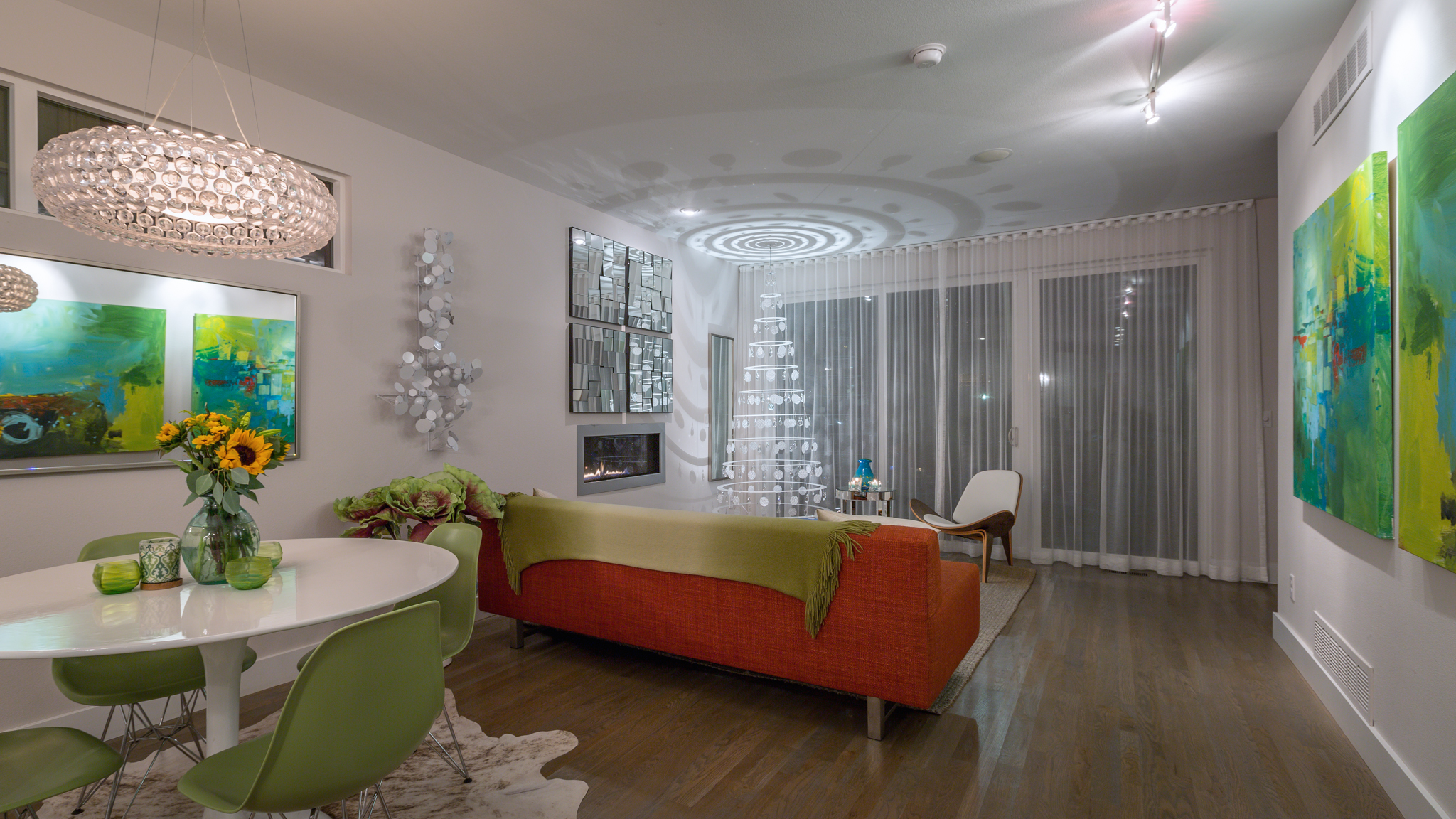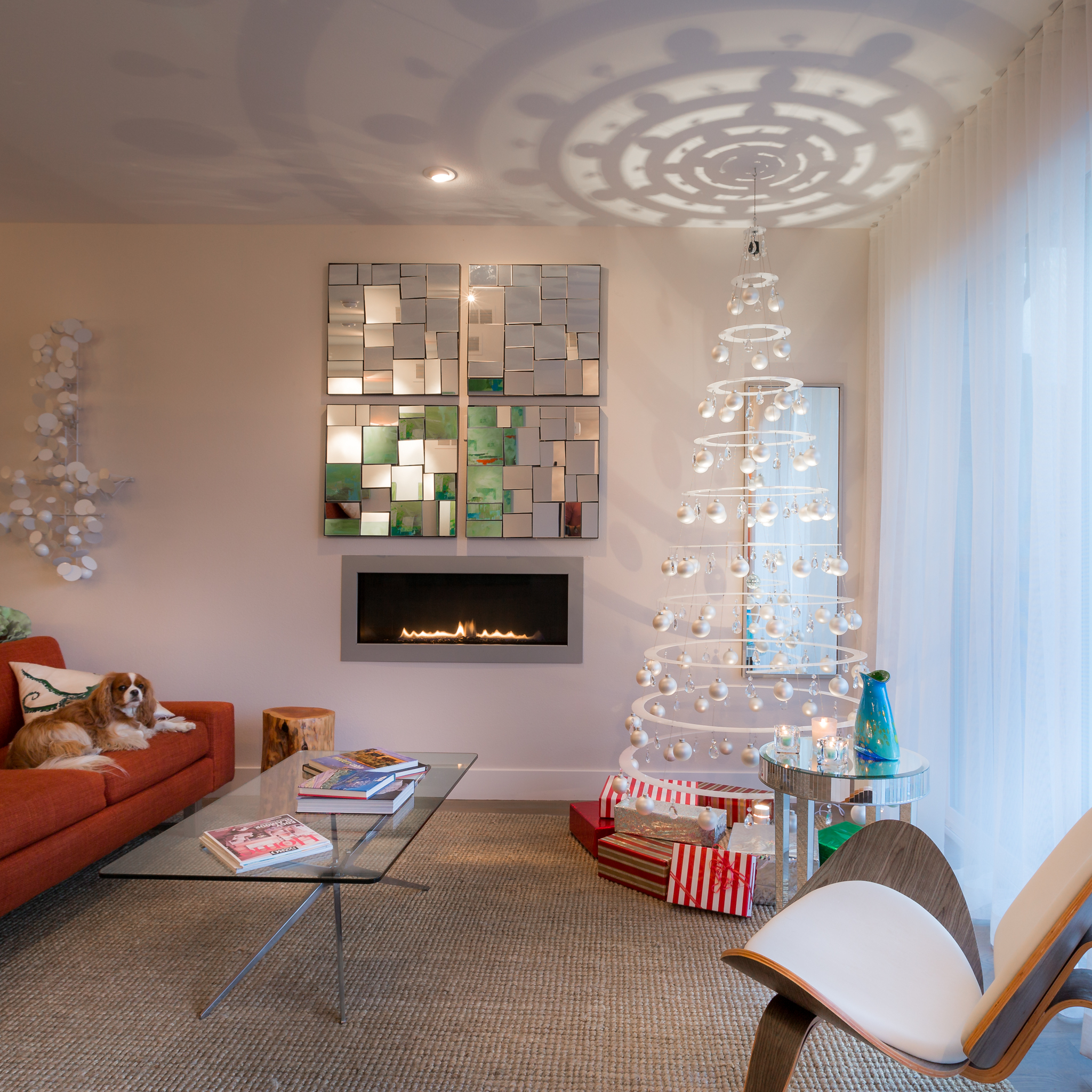 The White Hanging Modern Christmas Tree in a home and design contemporary 50s style art, decor, and furniture.